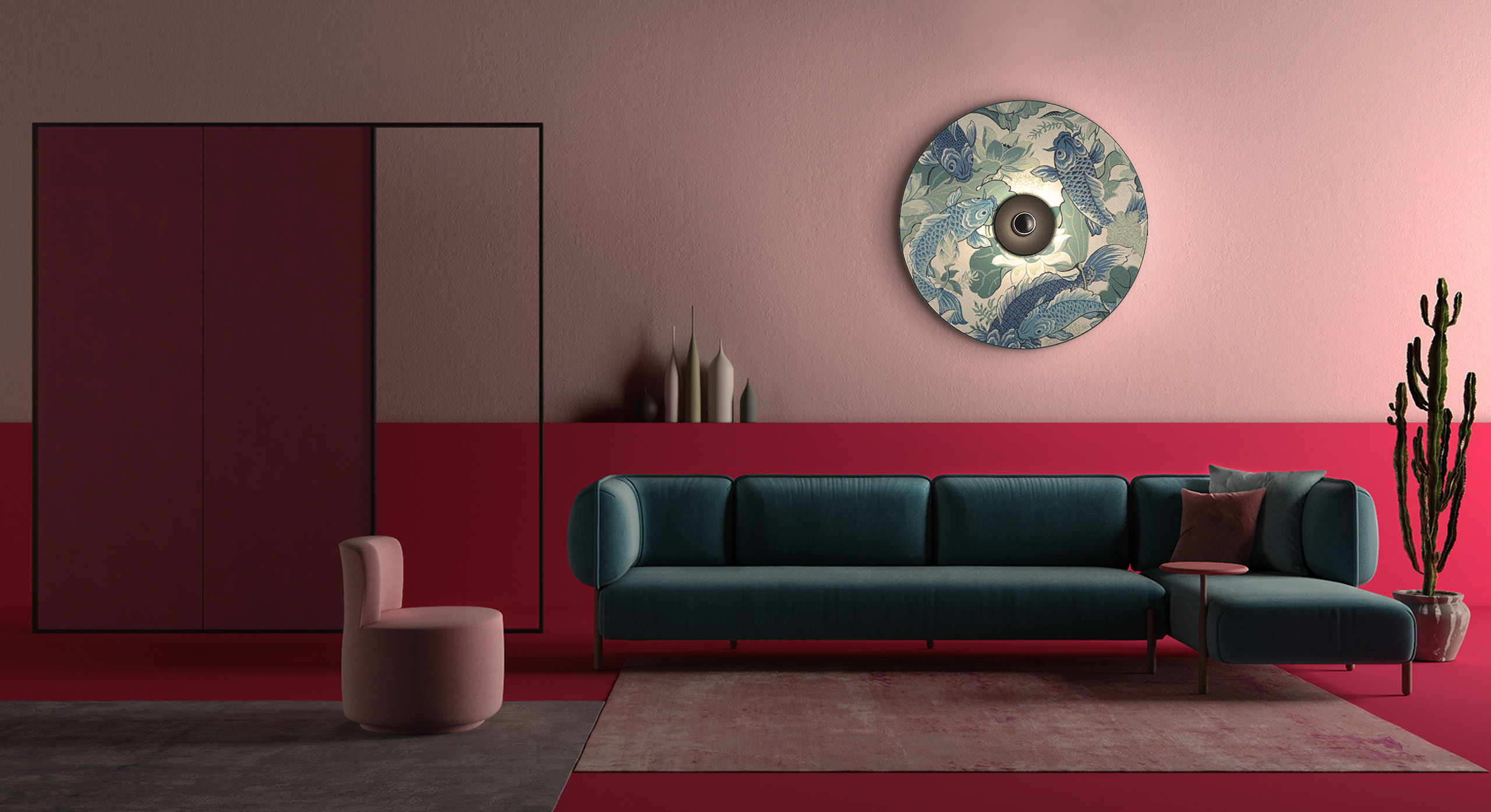 A premium front-lit series of wall & ceiling lighting in high quality fabrics entirely crafted by hand, designed exclusively in our studio. Simple and essential but at the same time rich in atmosphere this series is meant to give an exotic character and bring life to large spaces.
